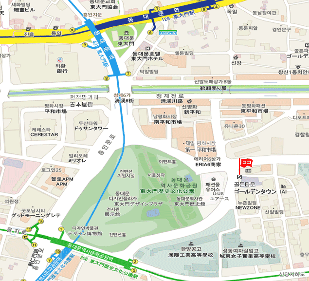 ①地下鉄 1·4号線の東大門運動場駅 (No.128 · No.421 トンデムン・Dongdaemun)で降りて、 駅 7番出口を出て、徒歩 約 6分所要。 ②地下鉄 2·4·5号線の東大門駅 (No.205·422·536 トンデムンウンドンジャン・Dongdaemun Stadium) で降りて、駅1番出口を出て、徒歩 約7分所要。 ③地下鉄 6号線の新堂駅 (No.635 シンダン・Sindang)で降りて、 駅 10番出口を出て、徒歩 約 5分所要。