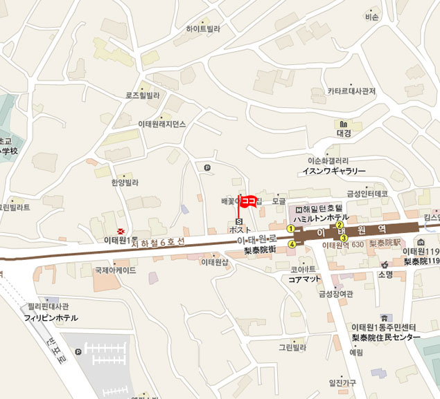 現地 アクセス  地下鉄 6号線の梨泰院駅 (No.630 イテウォン・Itaewon)で降りて、