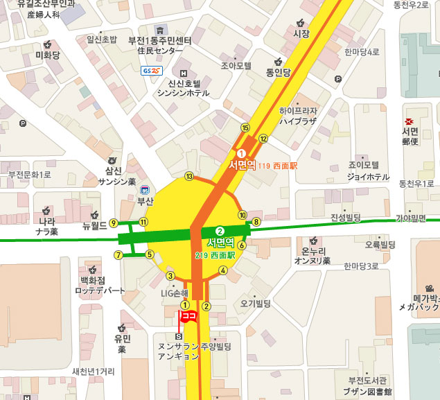 現地 アクセス  地下鉄 1号線,2号線 西面 (No.119、No.219 Seomyeon)駅 1番出口より徒步 約1分