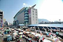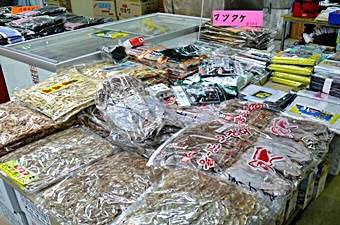 1階は魚市場、約180軒のお店が入っています。 2階は乾物市場でのり、スルメ、昆布、わかめなど 約80軒の乾物屋さんがあります。