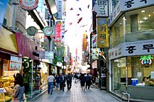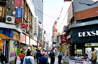 1970年代に汝矣島の開発が本格化するまで、明洞は銀行や証券会社などが集まり、韓国経済の中心地でもありました。高級ブティックや靴カバン専門店、カラオケボックス、レストランやファストフード店、屋台や露店などが数多く立ち並んでおり、日本人観光客相手のメガネ屋やエステなども多く、韓国でもトップクラスの規模と人気を誇る観光地です。