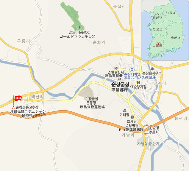現地 アクセス       江南セントラルシティターミナルより淳昌(スンチャン)行きバスに乗り、淳昌市外バスターミナルから