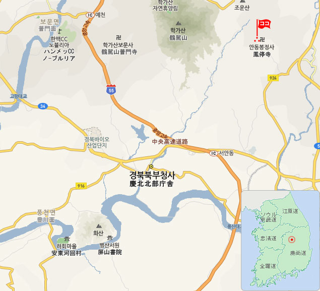 鳳停寺(ボンジョンサ)は古代国家新羅の文武王時代の672年から続く古刹で、統一新羅時代の名僧.義湘(ウィサン)、あるいは義湘の弟子であった能人(ヌイン)によって創建されたと伝えられています。創建以後の記録は朝鮮戦争の際に全て消失してしまったため細かな詳細は不明のままですが、一説によりますと修行を終えた能人が紙で鳳凰を折って飛ばしたところ、風に乗ってこの地で降り立ったことから後にこの地に寺を建て鳳停寺と名づけたと伝えられています。鳳停寺は安東市内から車で約30分ほどの位置にあり、山の深い緑に包まれた静かで趣のある寺院で、現在でも多くの僧侶が鳳停寺で修行を行っています。
