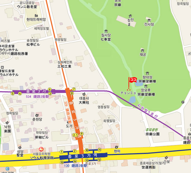 現地 アクセス  1.地下鉄 1号線 鐘路3街駅の 11番出口を出て、徒歩 約10分。