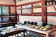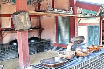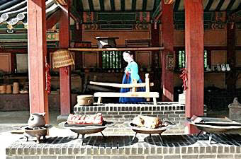 こちらではドラマに使われた様々な場所、配膳を行う台所の退膳間(テソンガン)、王の食事を調理する台所水刺間(スラッカン)、チャングムの台所、チャングムが投獄された獄舎(オクサ)、宮殿で使われる醤や塩辛類を保存しておく醤庫(チャンゴ)などさまざまなシーンに使われた場所を見学することができます。