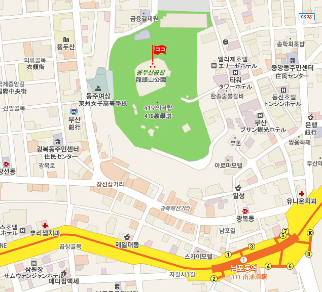現地 アクセス  釜山地下鉄1号線南浦洞(ナンポドン)駅下車、1番出口から徒歩で約10分