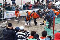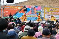 小正月(旧暦1月15日)の火祭りは、済州市のエウォル村、ポンソン里で毎年、旧正月の3日間のわたって行われる郷土のお祭りです。広大な野原に大きな篝火を焚き、家内安全と豊饒を祈り、人間と自然が一つになって限りない幸せを願う済州島の郷土民俗行事です。早くから牧畜業が盛んだった済州島では、生活の知恵として早い時機から、放牧地にわざと火をつける「火入れ」という風俗がありました。「火入れ」によって、ダニなどの有害な虫が死に、燃えた草木が灰になって、新しく生えてくる草木の肥料になり、また草も柔らかく味もよくなるので、牛や馬が喜んで食べると言います。